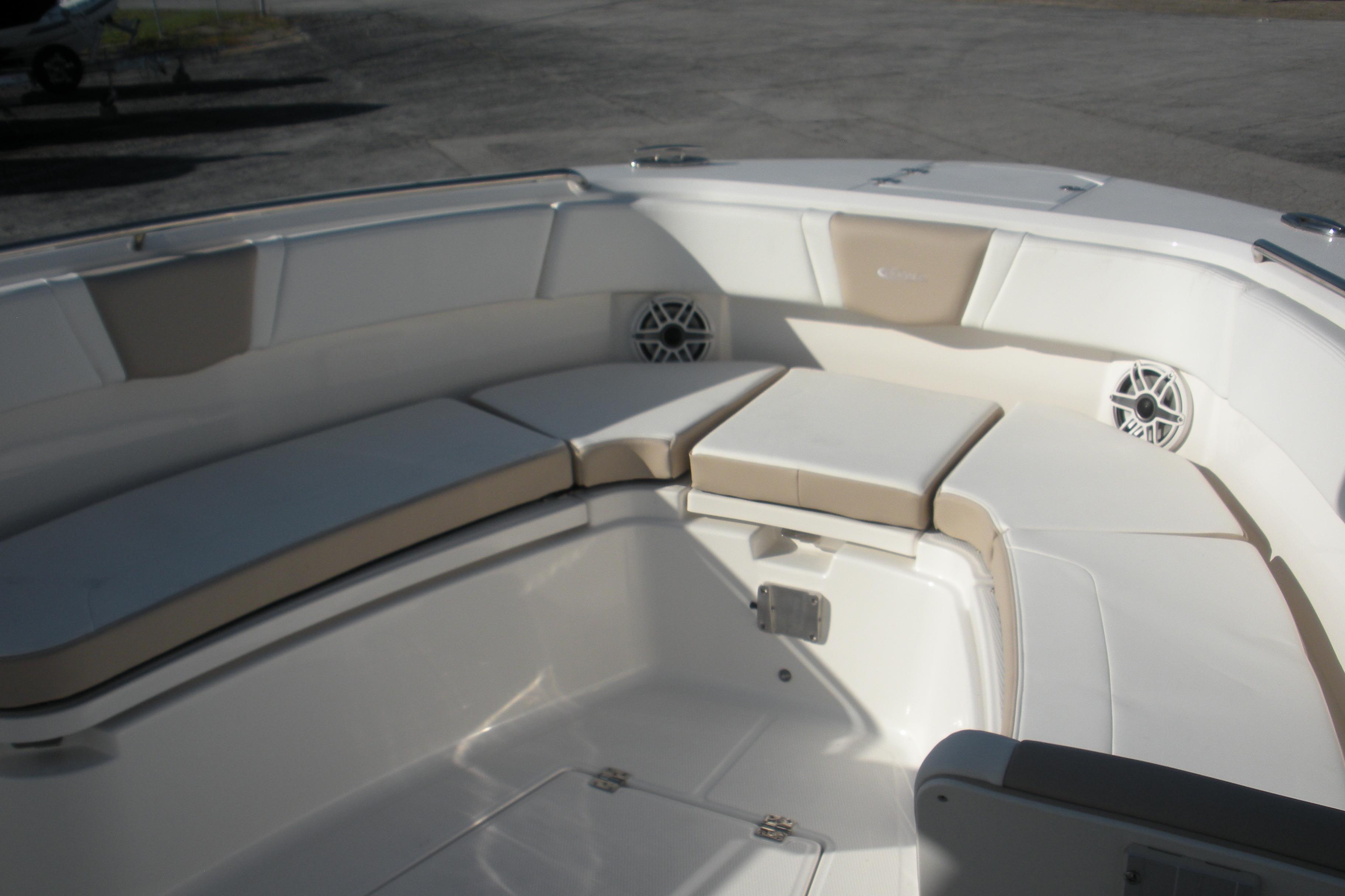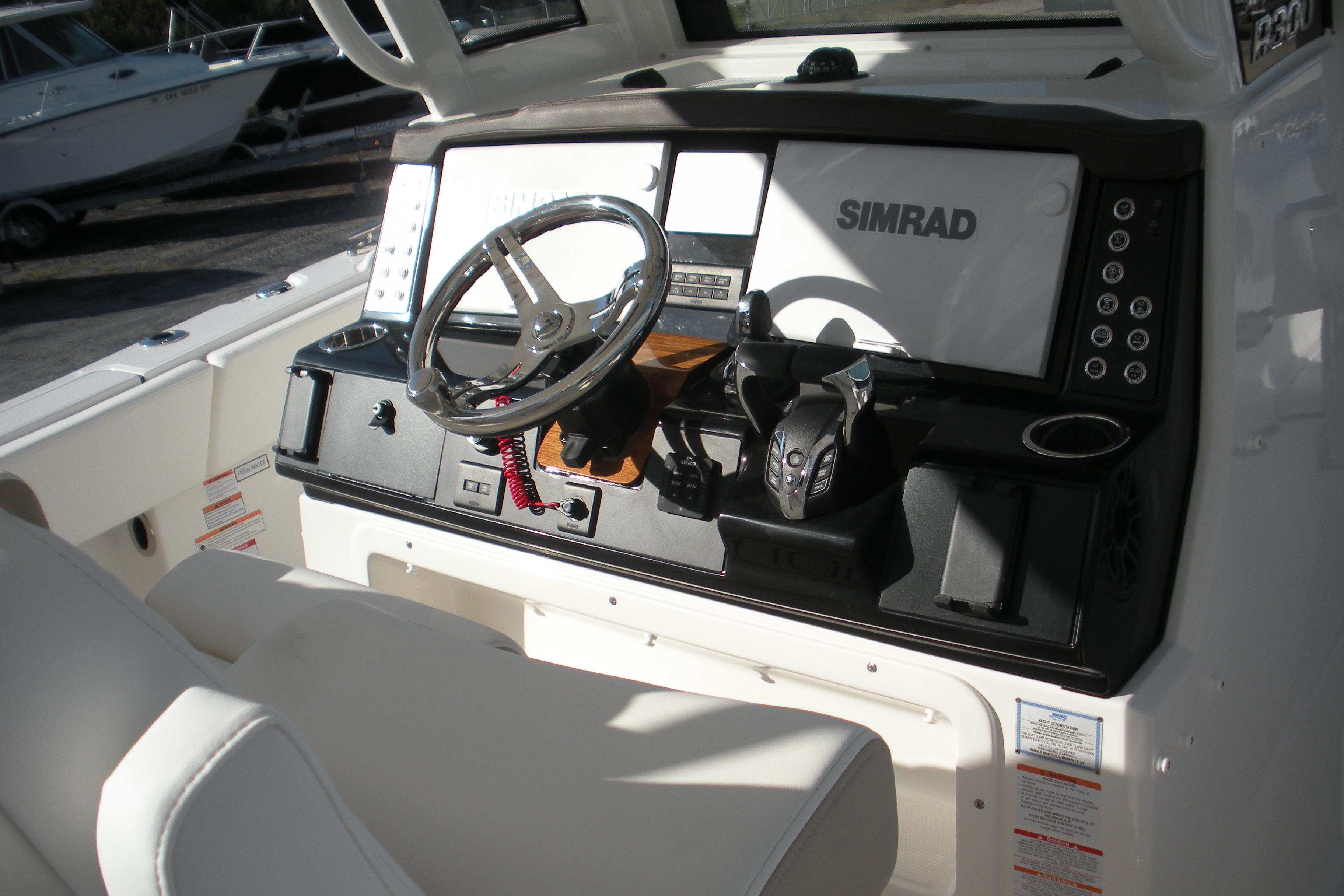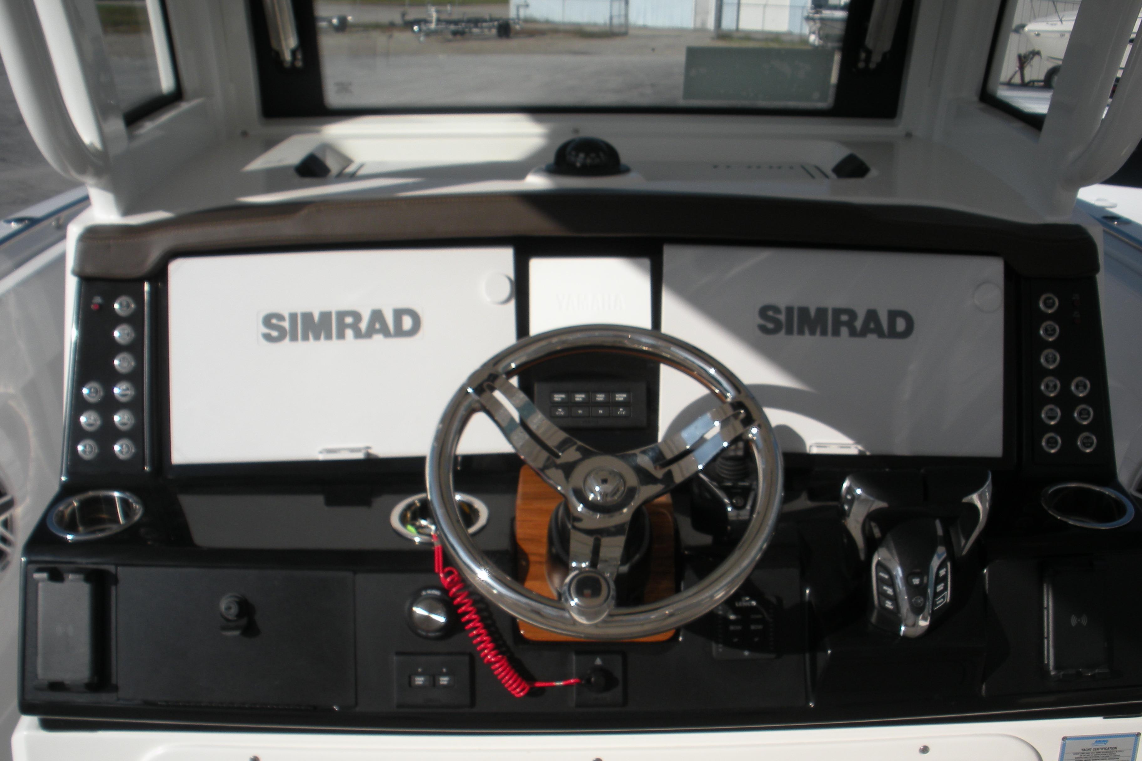 Options Include: Yamaha Helm Master EX with Maneuverability, Console/Helm Seat Cover, Dual Simrad NSS4/16, Simad VHF, Dual Color LED Underwater Lights (2), Seadek Helm Mat, Cabin Wood Flooring, (4) - Stainless Steel Drink/Rod Holders, Polished Stainless Steel Anchor.
