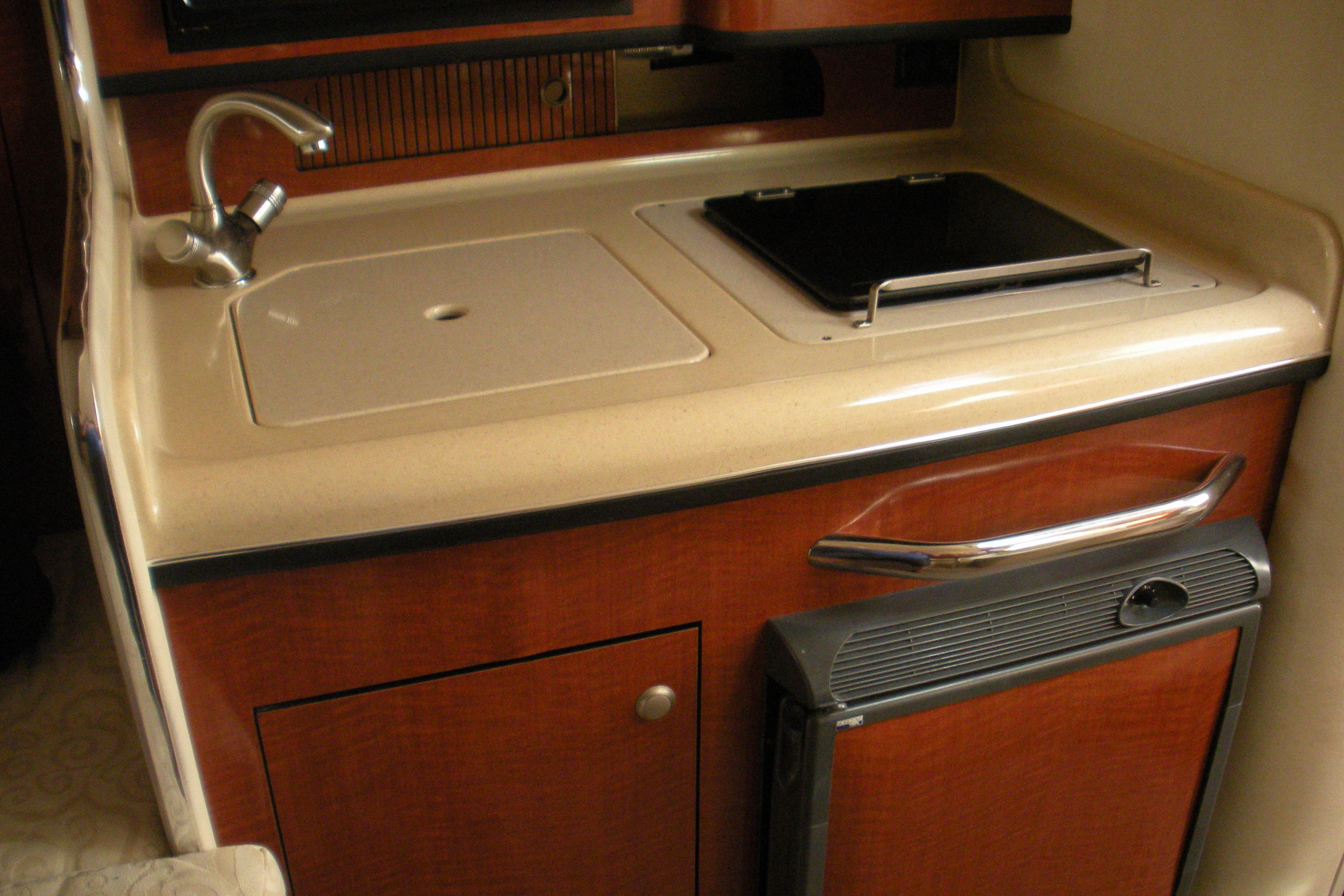 Options Included: Full Camper Canvas, Garmin, VHF, Stereo, Compass, Trim Tabs, Windlass, Dual Batteries, AC/Heat, TV, Washdown, Marine Stand up Head, Shore Power, Swim Platform, Bottom Paint & More.