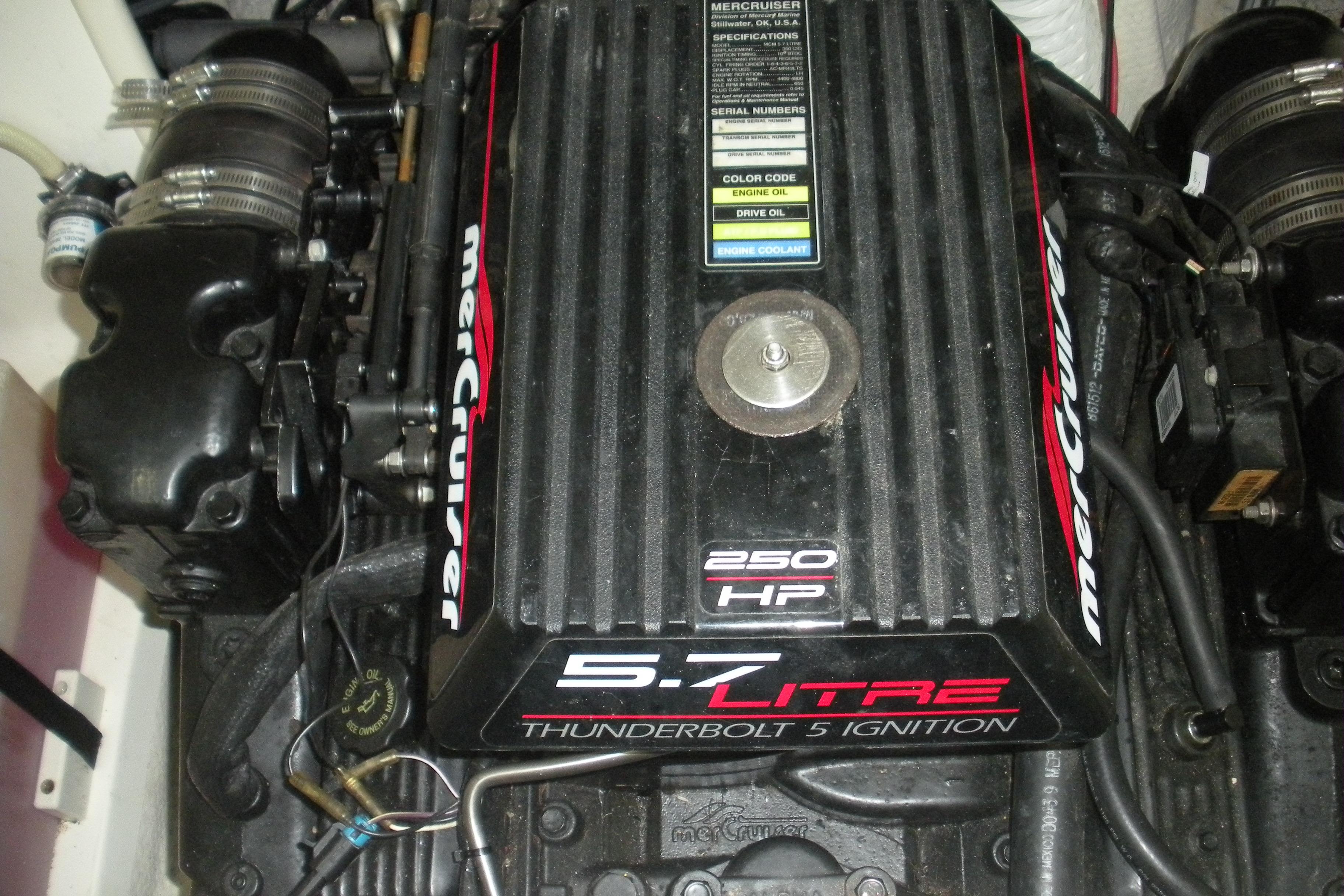 Total Power: 250|horsepower Engine Brand: MerCruiser Year Built: 1999 Engine Model: 5.7L Engine Type: Inboard/Outboard Engine/Fuel Type: unleaded Engine Hours: 0 Engine Power: 250|horsepower